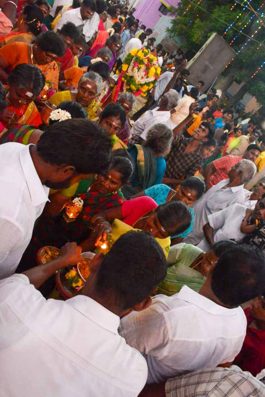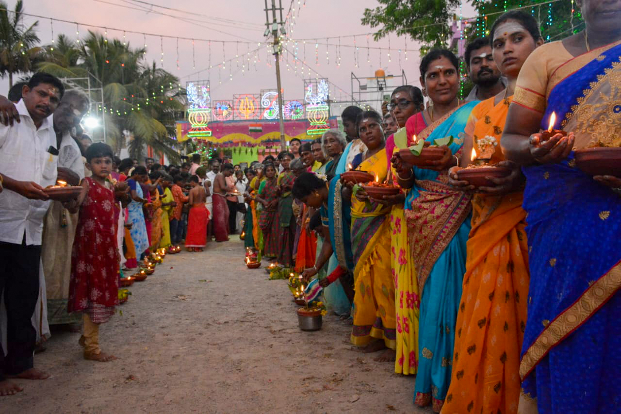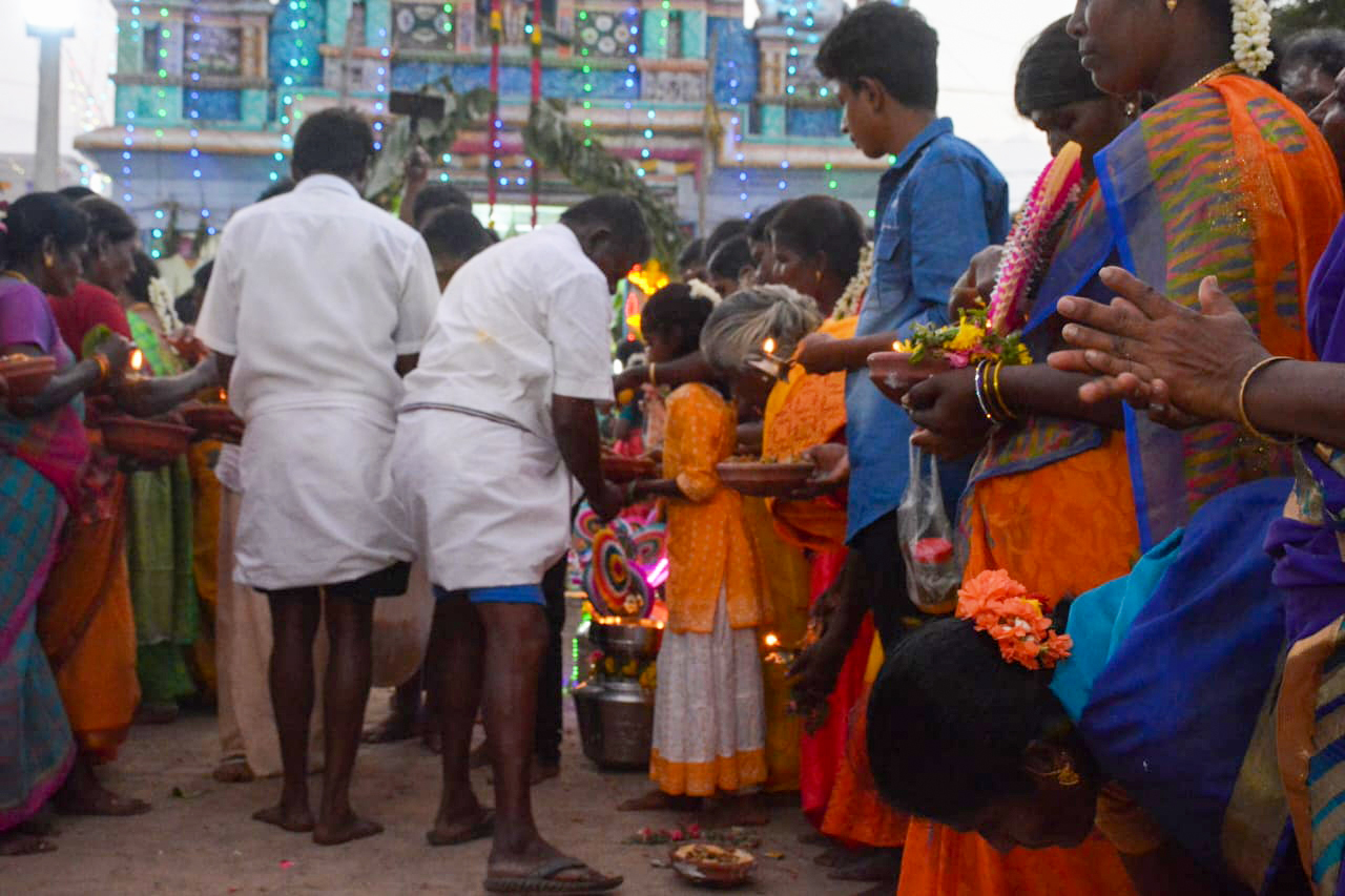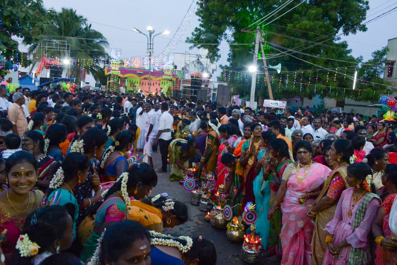 நூற்றுக்கணக்கான மண் கலயங்களில் சோறு, குழம்பு இட்டு விளக்கேற்றி மக்கள் ஊர்வலமாக வருகின்றனர்.