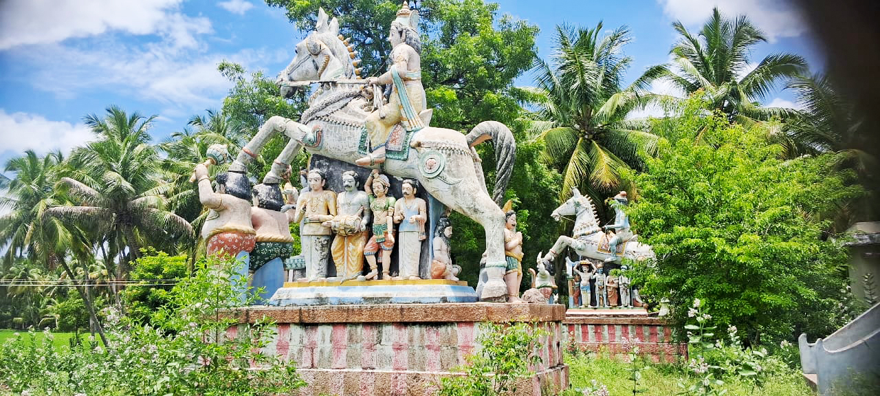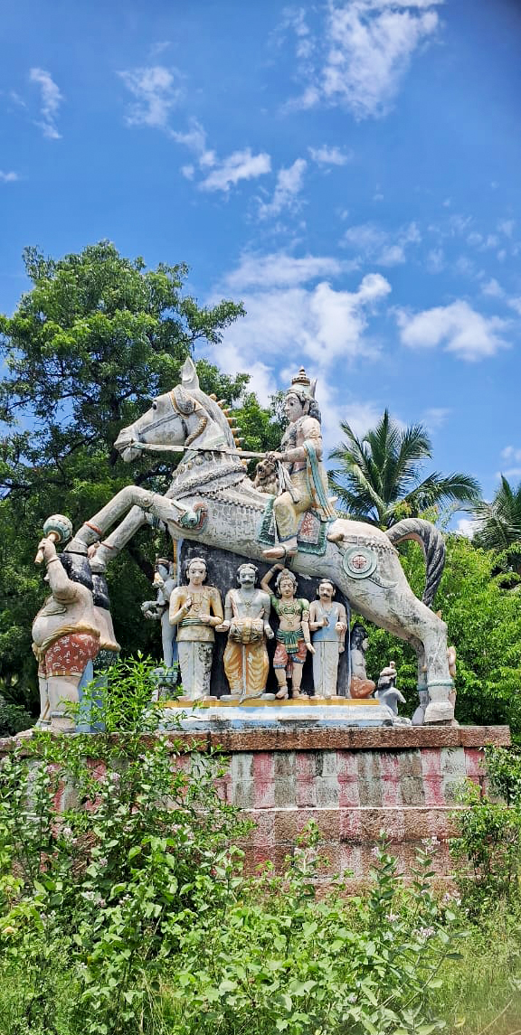 இவ்விடத்தில் தனித்தனியே இரண்டு பீடங்களின் மேல் பிரம்மாண்டமான குதிரை சிற்பங்கள் காணப்படுகின்றன. முதல் சிற்பத்தில் அய்யனார் ஒரு குதிரையின் மீது மடியில் சிங்கத்துடன் அமர்ந்துள்ளார். குதிரையின் முன் கால்களை இரு பூதகணங்கள் தங்கள்தலையின்மேல் தாங்கியபடி நின்றுள்ளன. குதிரையின் காலின்கீழ் பூதகணங்கள், சிவன், விஷ்னணு, முனிவர்கள், இசை மற்றும் நடனக் கலைஞர்கள் ஆகியோர் உள்ளனர். இச்சிற்பத்திற்கு அருகில் உள்ள மற்றொரு குதிரைச் சிற்பத்தின் கீழ் பக்தர்கள் பல்வேறு பொருள்களை கொண்டு வந்து படைத்து வணங்குவது போல சிற்பம் காட்சிப்படுத்தப்பட்டுள்ளது.