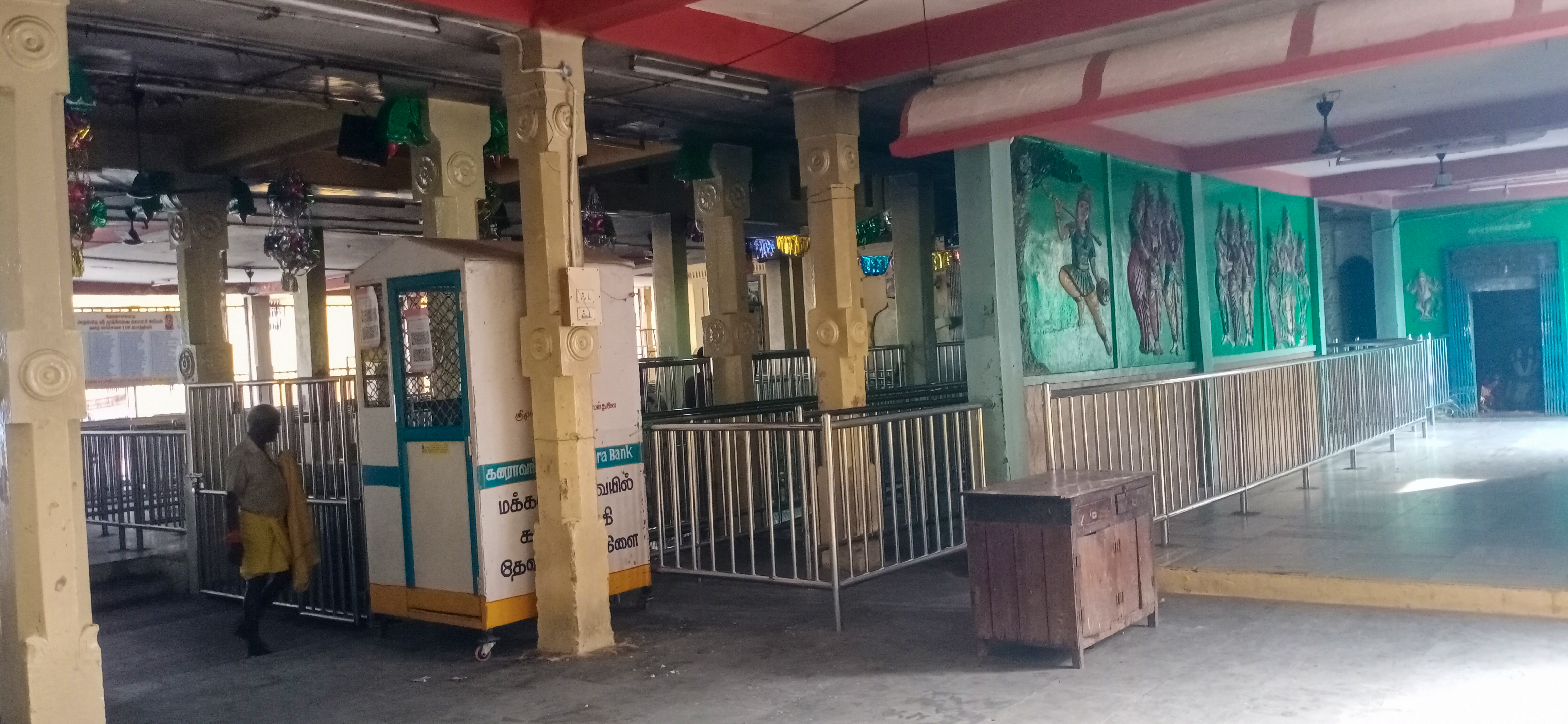 இங்குக் கருவறையின் மேல் விமானம் எதுவும் இன்றித் தர்ப்பைப் புல்லால் வேயப்பட்ட ஒரு கூரை மட்டும் உள்ளது. கோவிலைச்சுற்றிப் பெரிய திருச்சுற்று காணப்படுகிறது