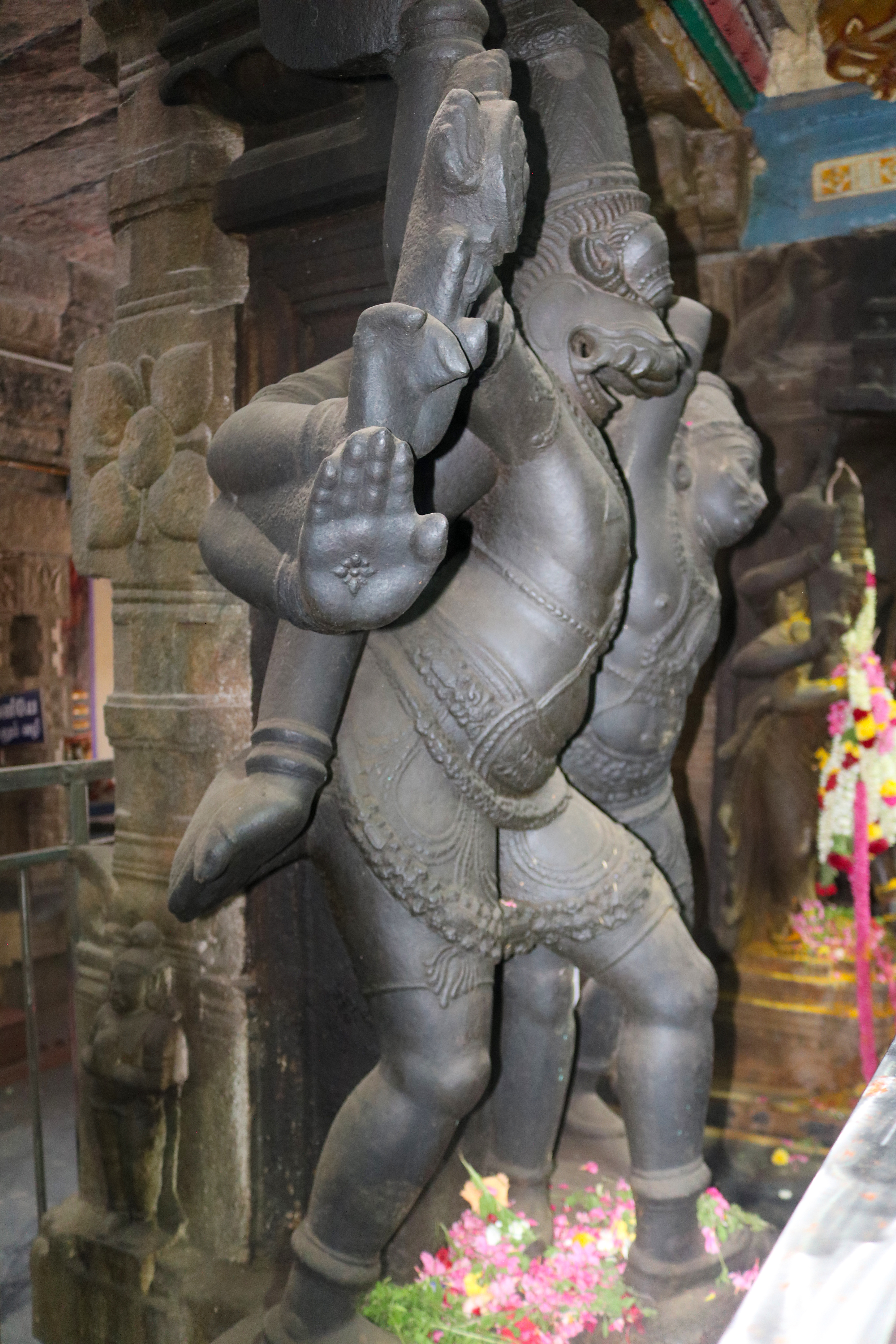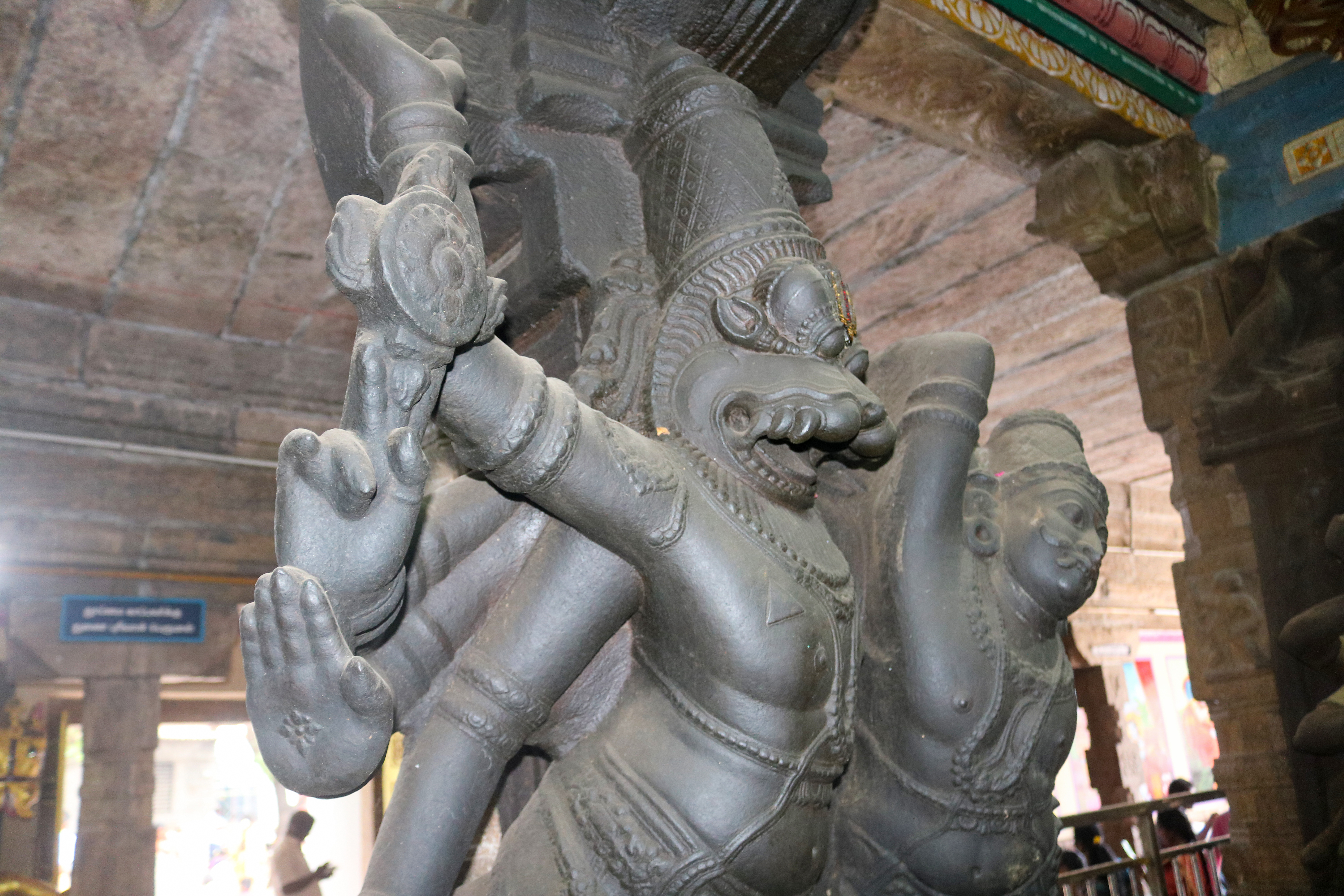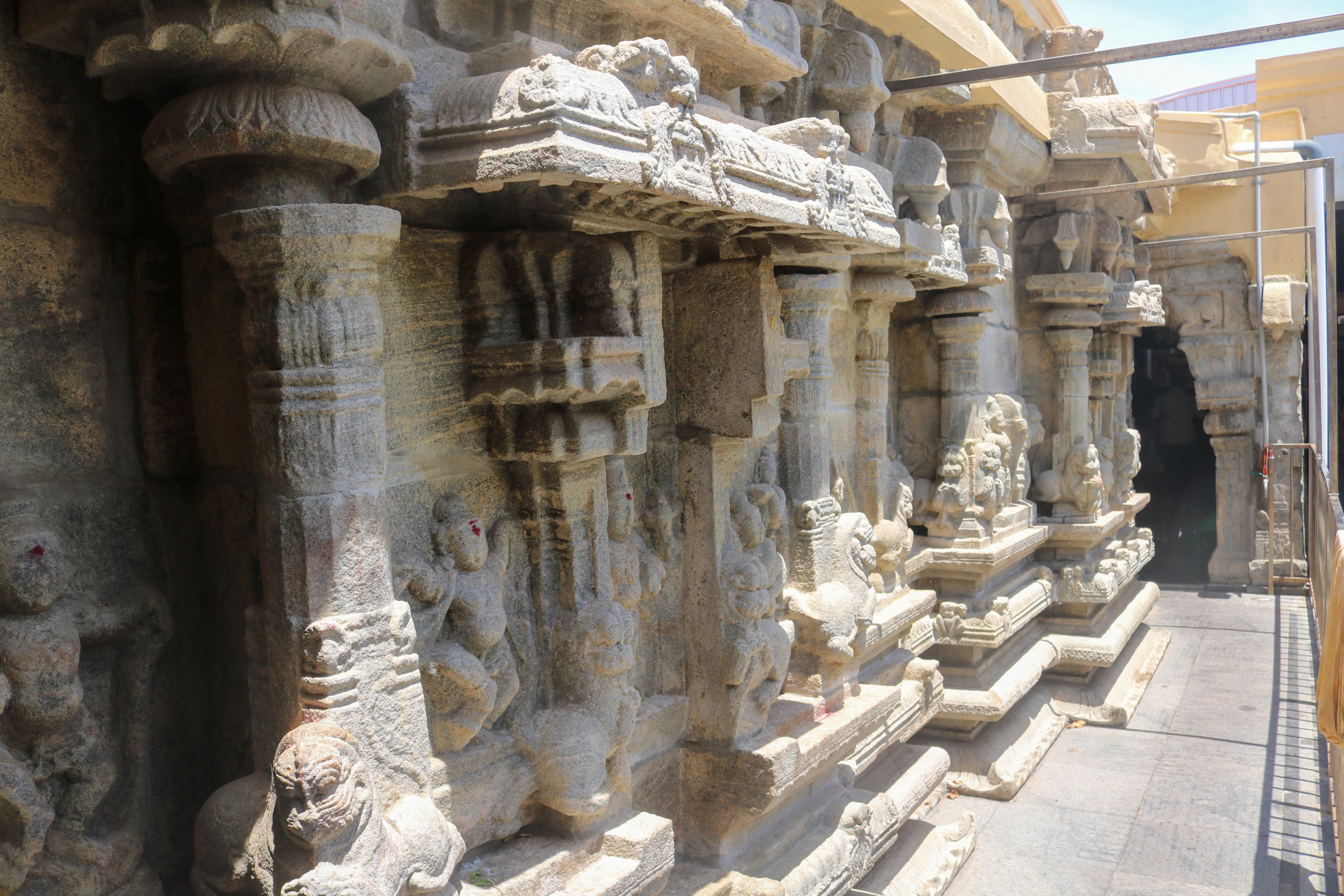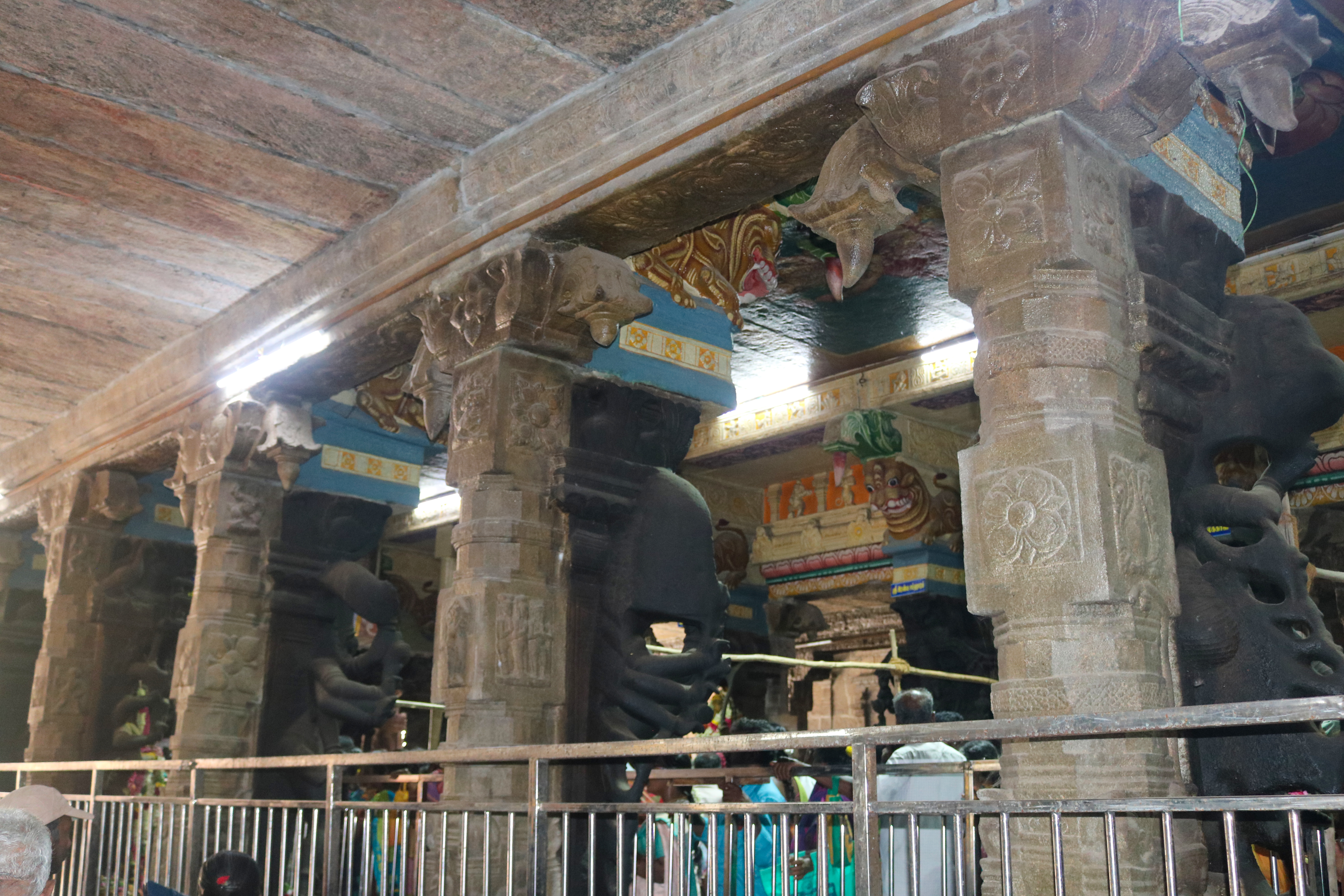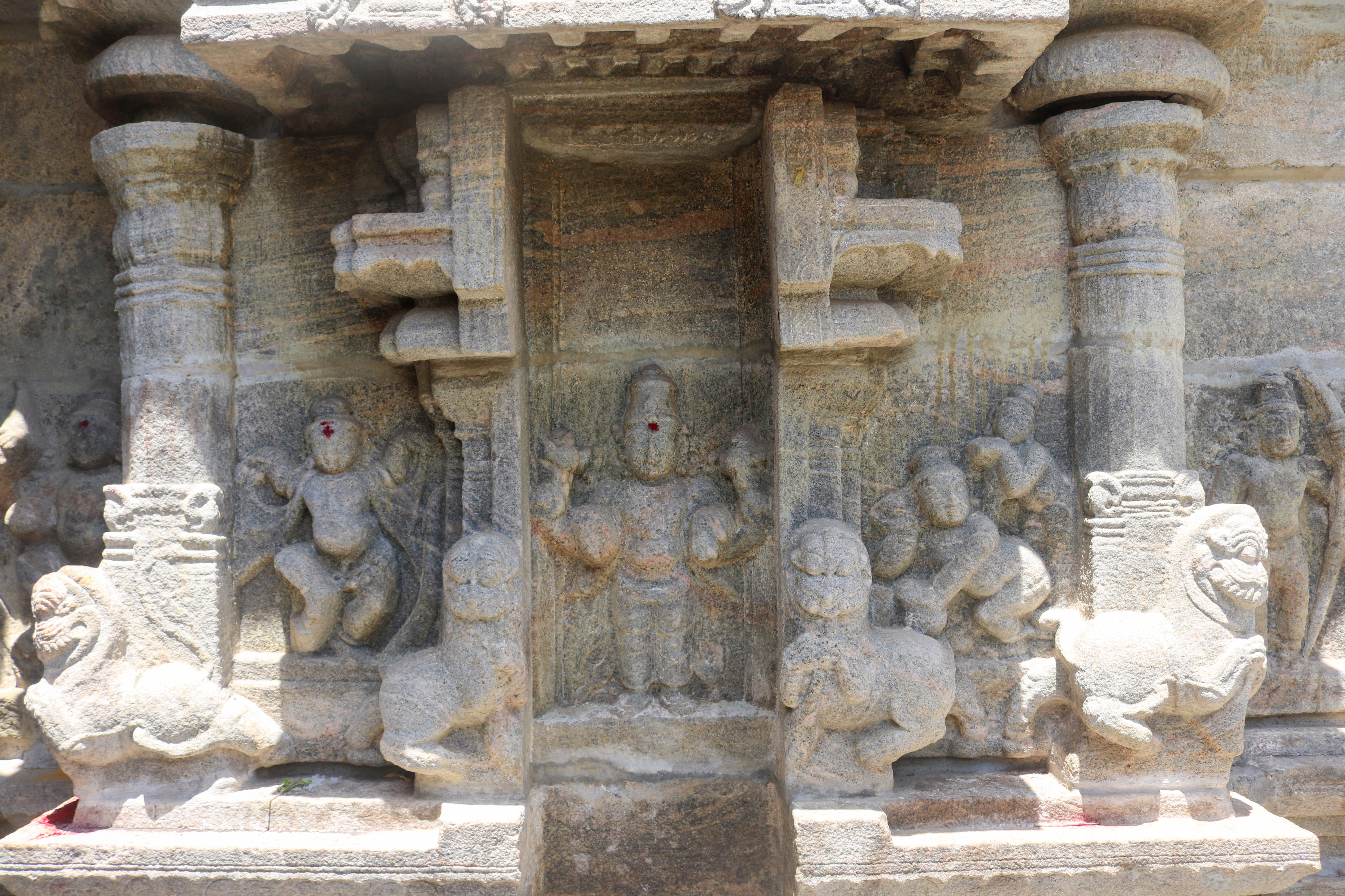 இக்கோயிலிலுள்ள மகாமண்டம், ஊஞ்சல் மண்டபம் மற்றும் அரங்க மண்டபத்தில் உள்ள தூண்களும் அதிலுள்ள சிற்பங்களும் மிக நேர்த்தியான கலைப்படைப்பாக உருவாக்கப்பட்டுள்ளன. மகாமண்டபத்தில் இசைத் தூண்கள் காணப்படுகின்றன. அரங்க மண்டபத்தில் உள்ள பதினான்கு தூண்களில் பிரம்மாண்டமாக ஒற்றைக் கல்லால் சிற்பங்கள் வடிக்கப்பட்டுள்ளன. இவற்றில் மகாபாரதம், இராமாயணம் தொடர்பான சிற்பங்களோடு பிற சைவ, வைணவம் தொடர்பான சிற்பங்களும் காணப்படுகின்றன. வைணவ மற்றும் சைவக் கருப்பொருள்கள் ஒன்றோடொன்று இணைக்கப்படுவது நாயக்கர் கோயில்களில் அவ்வப்போது பின்பற்றப்பட்டது. அந்த வகையில் இக்கோயிலில் சைவ, வைணவ கருத்துக்கள் பிரிவினையின்றிக் காணப்படுகின்றன. இது ஆட்சியாளர்கள் மற்றும் பொதுமக்களிடம் இருக்கும் சகிப்புத்தன்மையைப் பறைசாற்றும் வகையில் அமைந்துள்ளது.