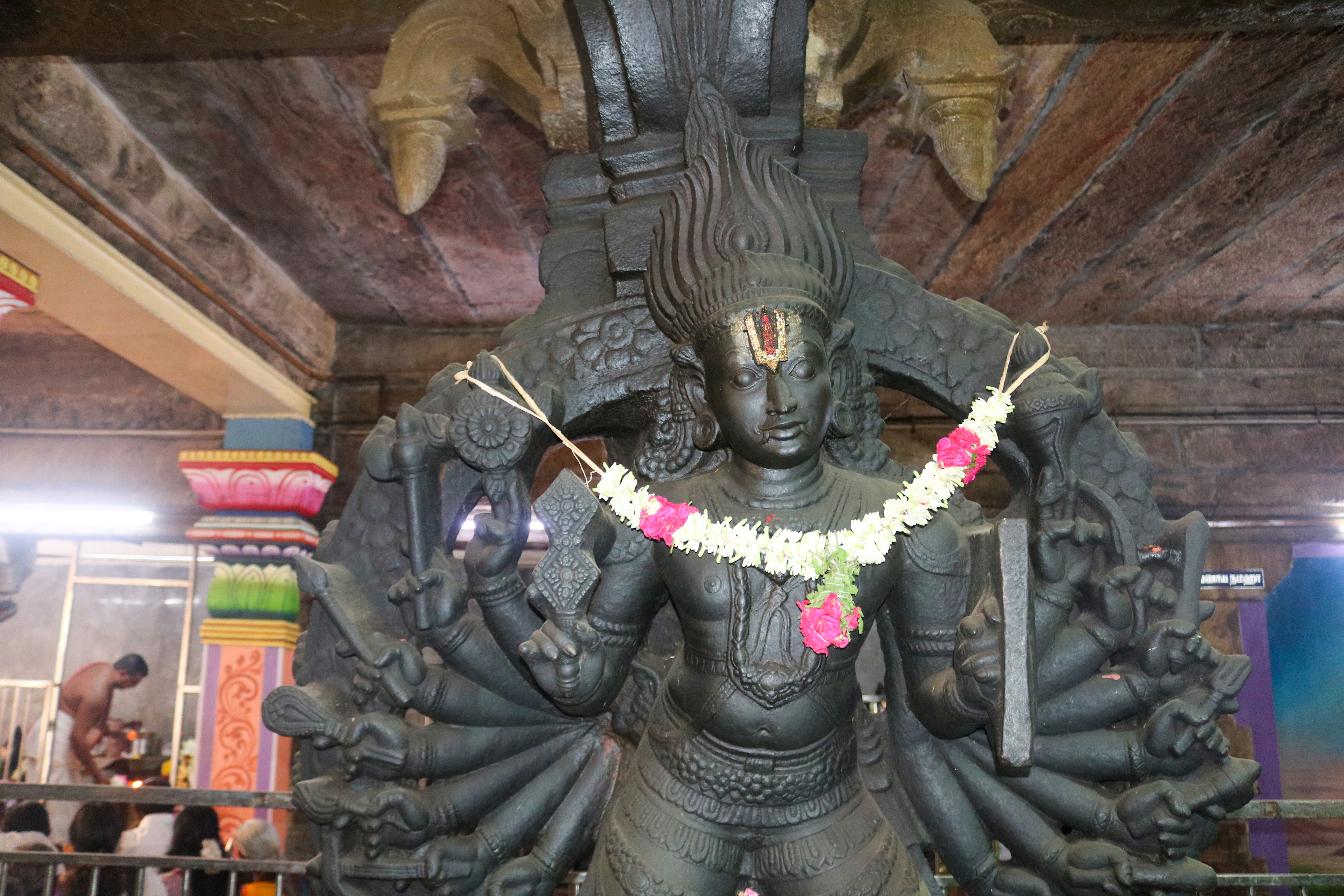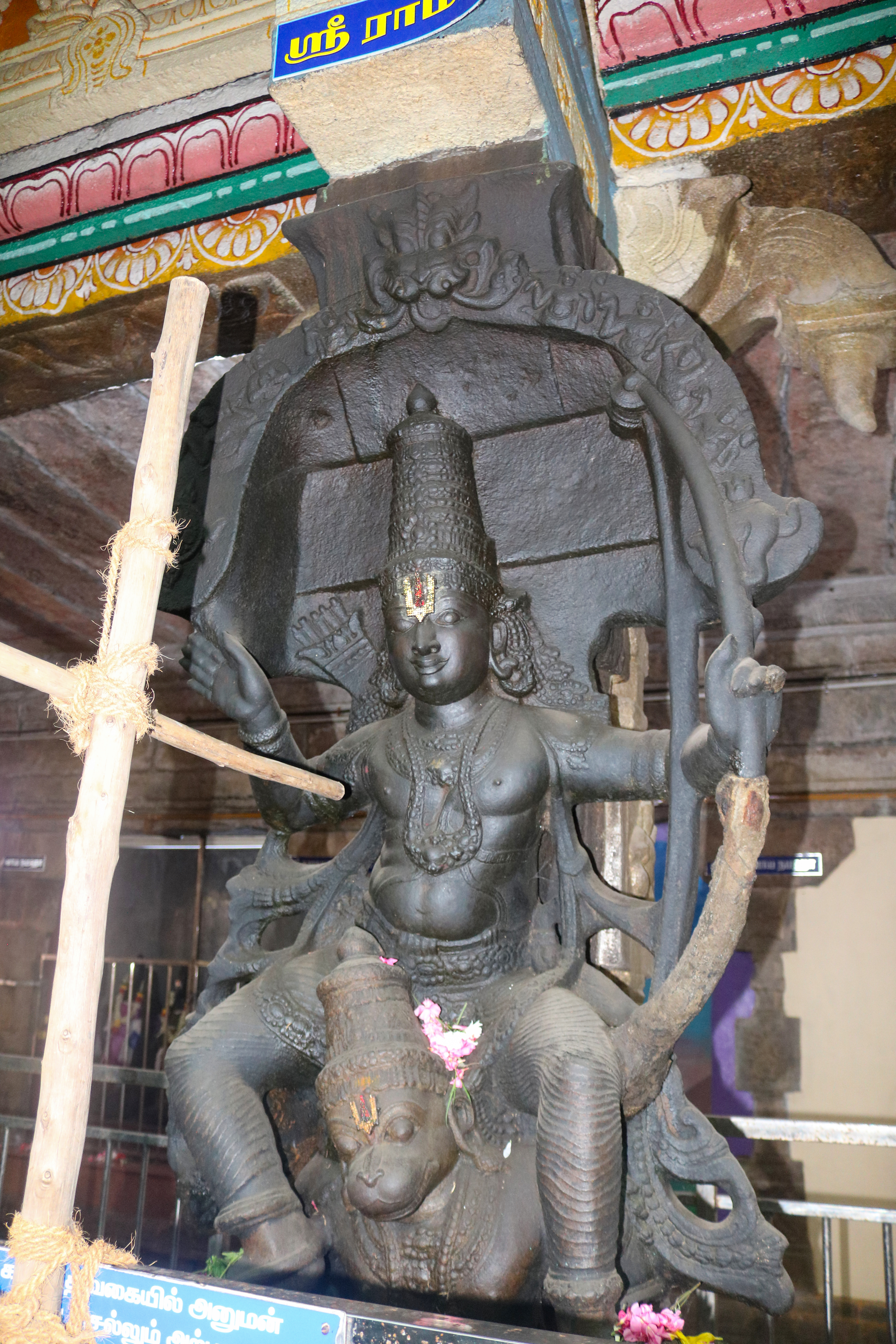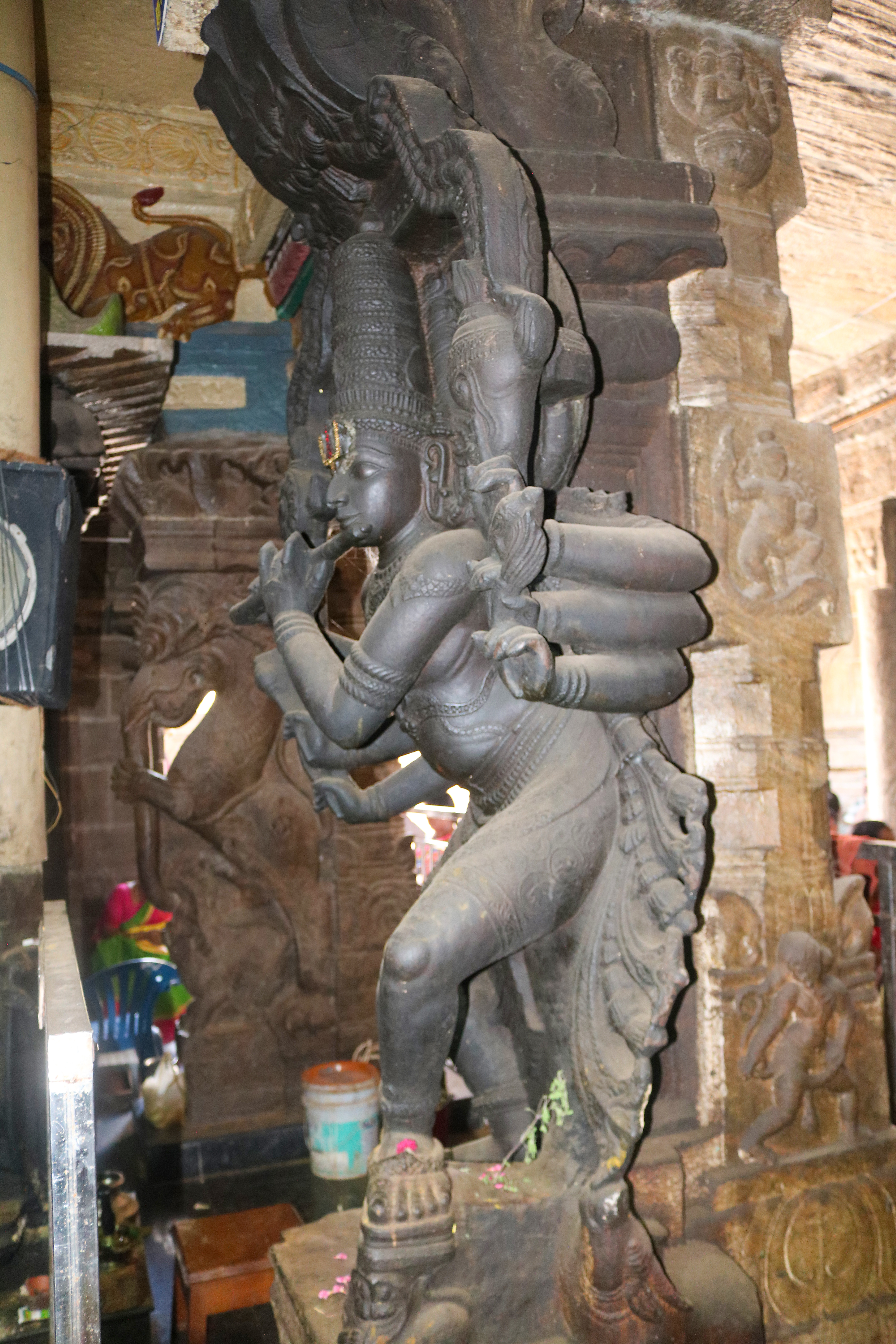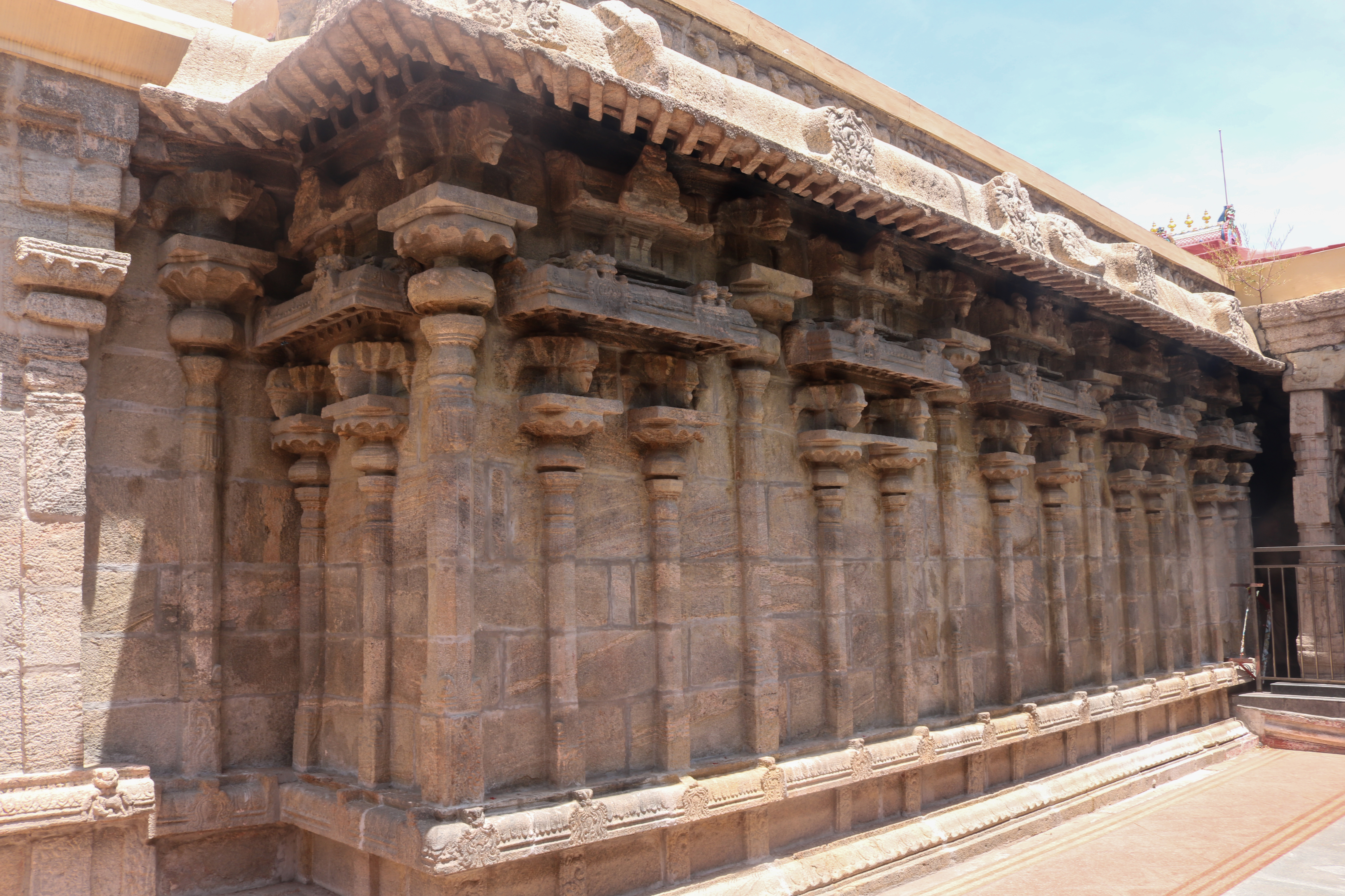 இக்கோயிலிலுள்ள மகாமண்டம், ஊஞ்சல் மண்டபம் மற்றும் அரங்க மண்டபத்தில் உள்ள தூண்களும் அதிலுள்ள சிற்பங்களும் மிக நேர்த்தியான கலைப்படைப்பாக உருவாக்கப்பட்டுள்ளன. மகாமண்டபத்தில் இசைத் தூண்கள் காணப்படுகின்றன. அரங்க மண்டபத்தில் உள்ள பதினான்கு தூண்களில் பிரம்மாண்டமாக ஒற்றைக் கல்லால் சிற்பங்கள் வடிக்கப்பட்டுள்ளன. இவற்றில் மகாபாரதம், இராமாயணம் தொடர்பான சிற்பங்களோடு பிற சைவ, வைணவம் தொடர்பான சிற்பங்களும் காணப்படுகின்றன. வைணவ மற்றும் சைவக் கருப்பொருள்கள் ஒன்றோடொன்று இணைக்கப்படுவது நாயக்கர் கோயில்களில் அவ்வப்போது பின்பற்றப்பட்டது. அந்த வகையில் இக்கோயிலில் சைவ, வைணவ கருத்துக்கள் பிரிவினையின்றிக் காணப்படுகின்றன. இது ஆட்சியாளர்கள் மற்றும் பொதுமக்களிடம் இருக்கும் சகிப்புத்தன்மையைப் பறைசாற்றும் வகையில் அமைந்துள்ளது.