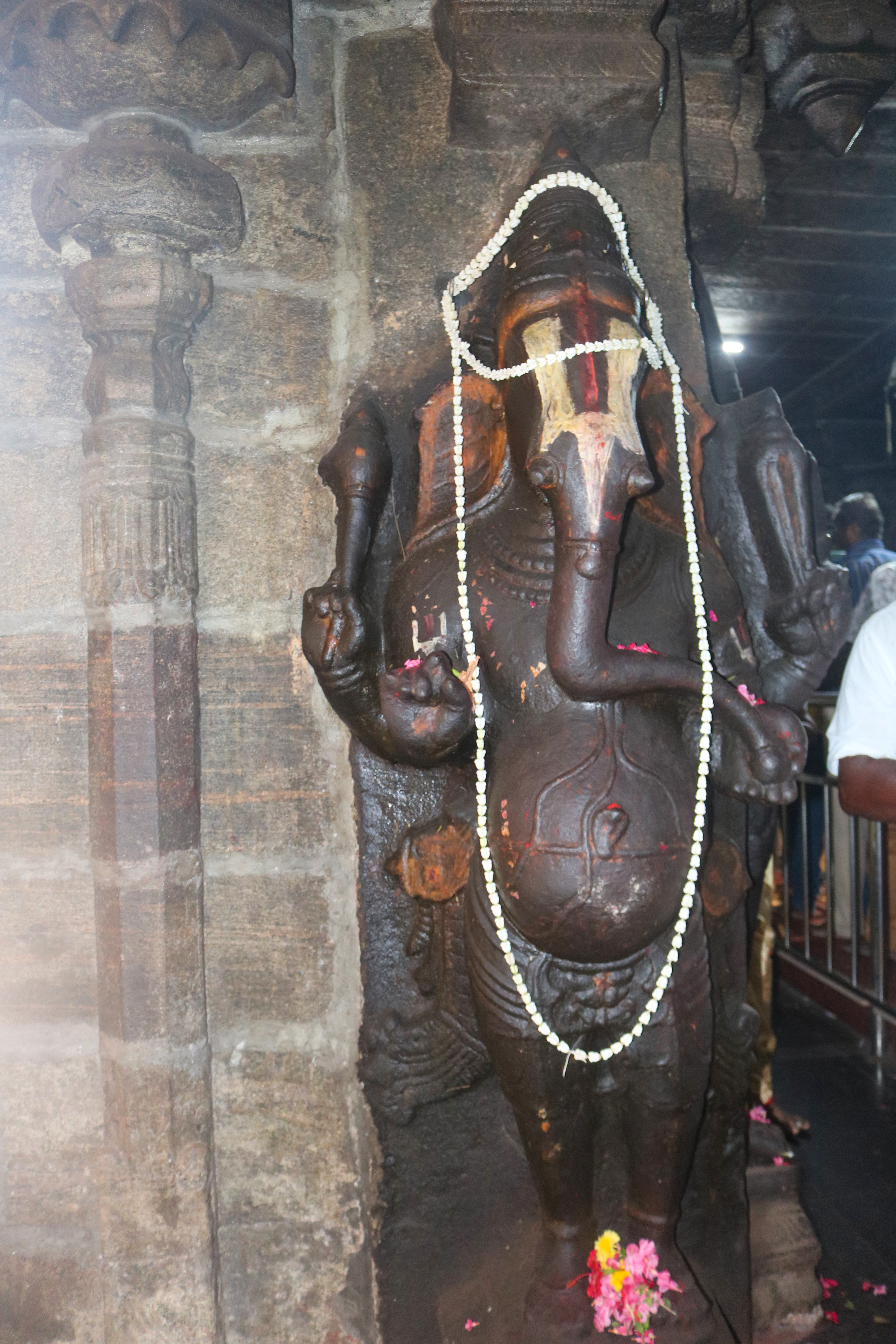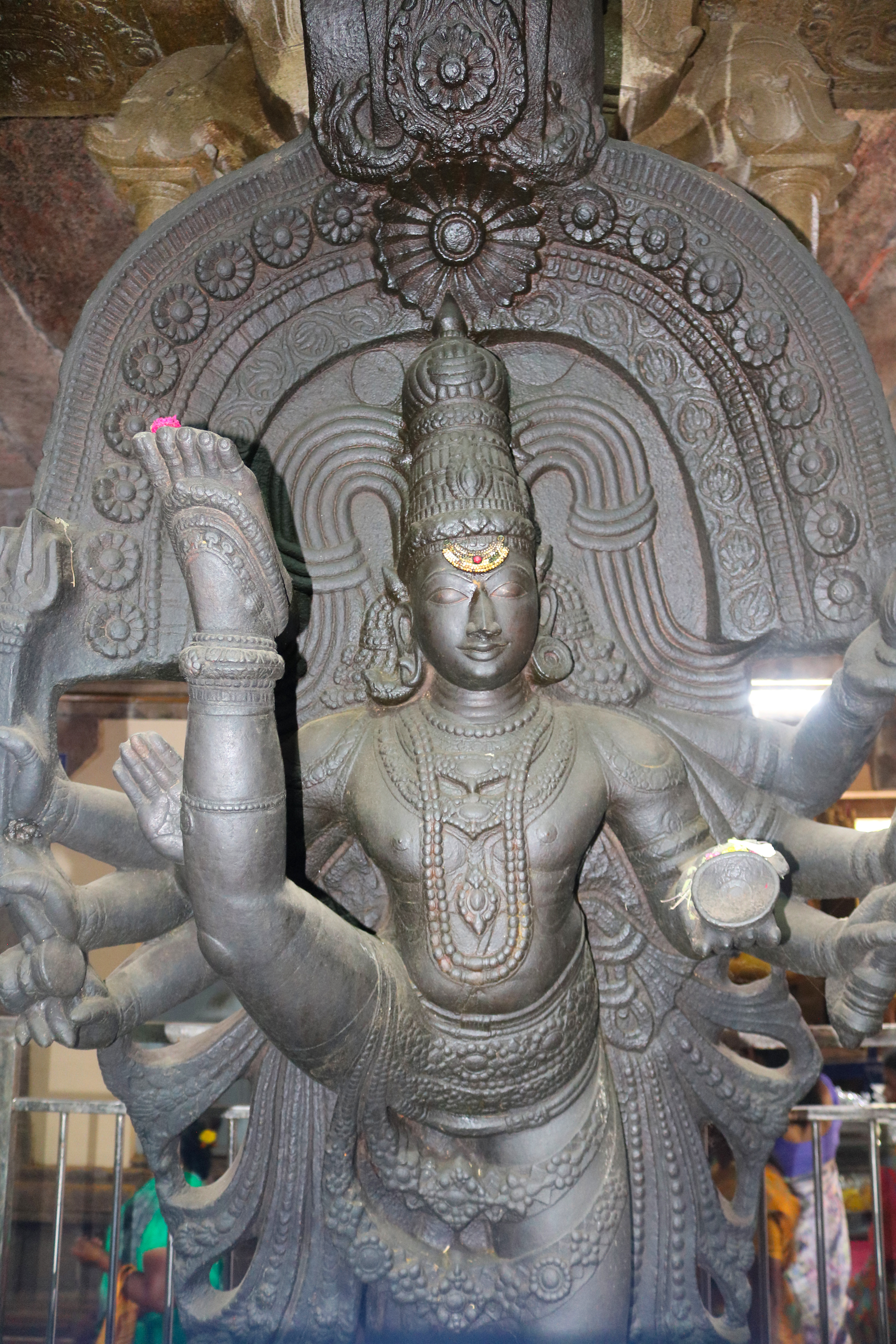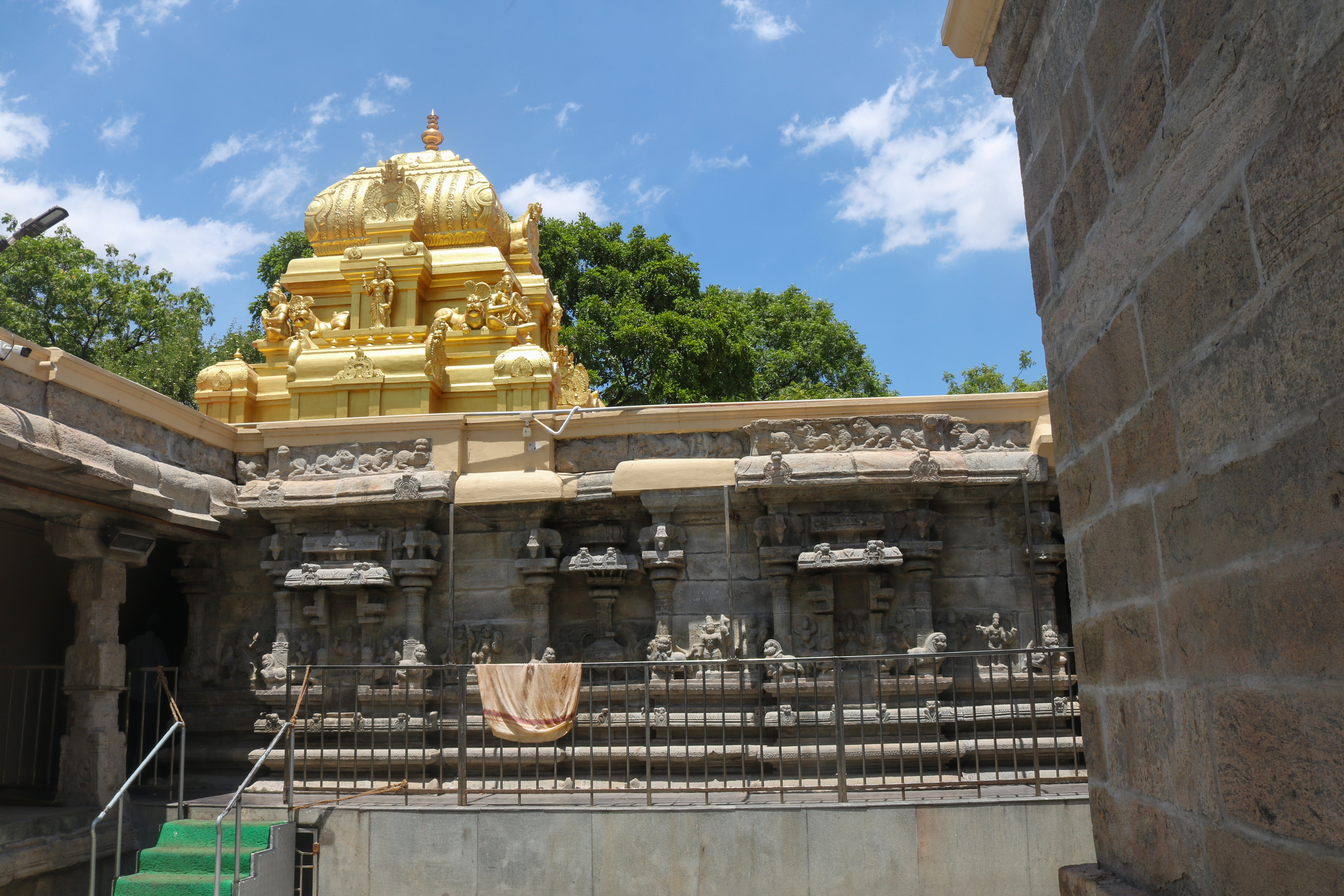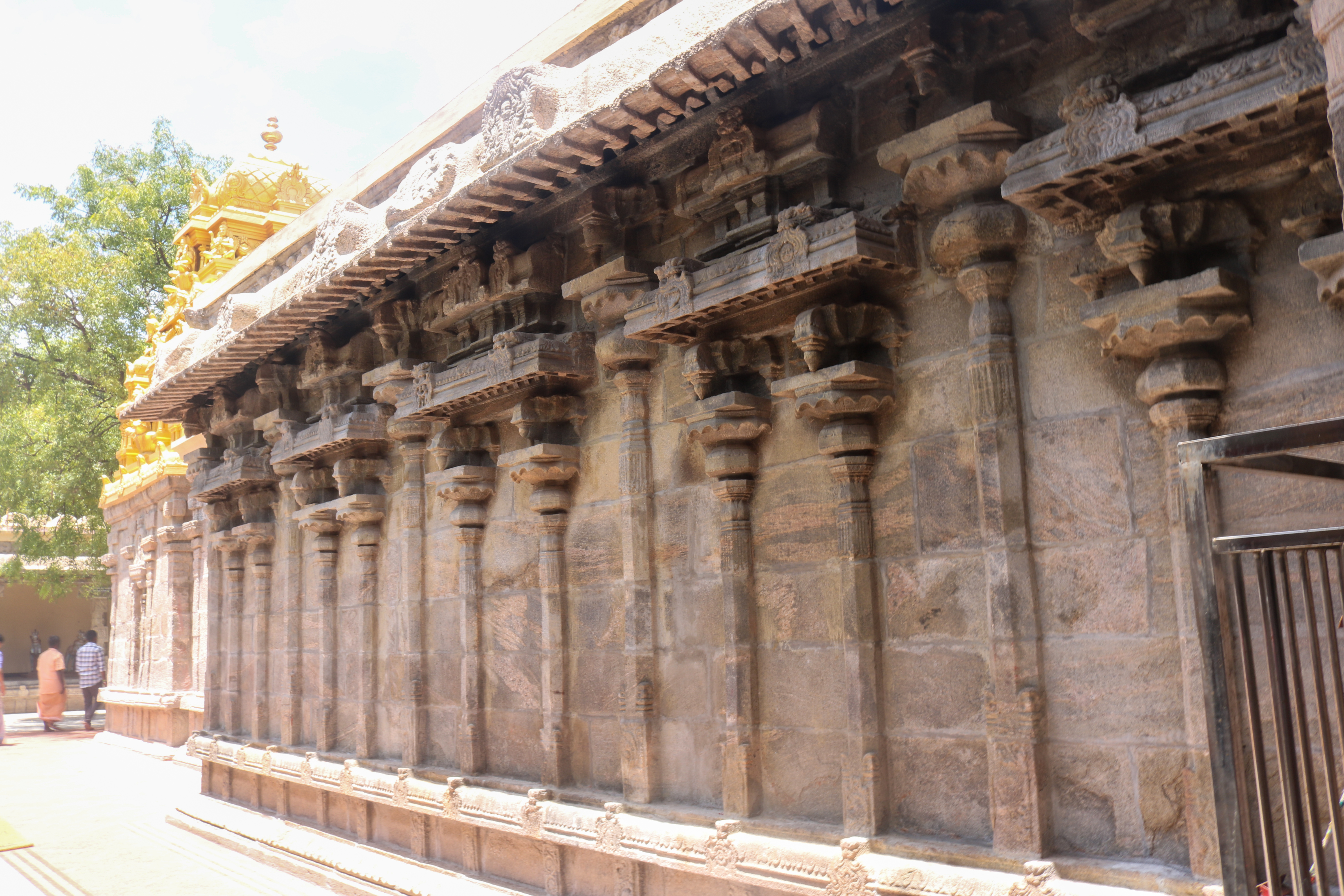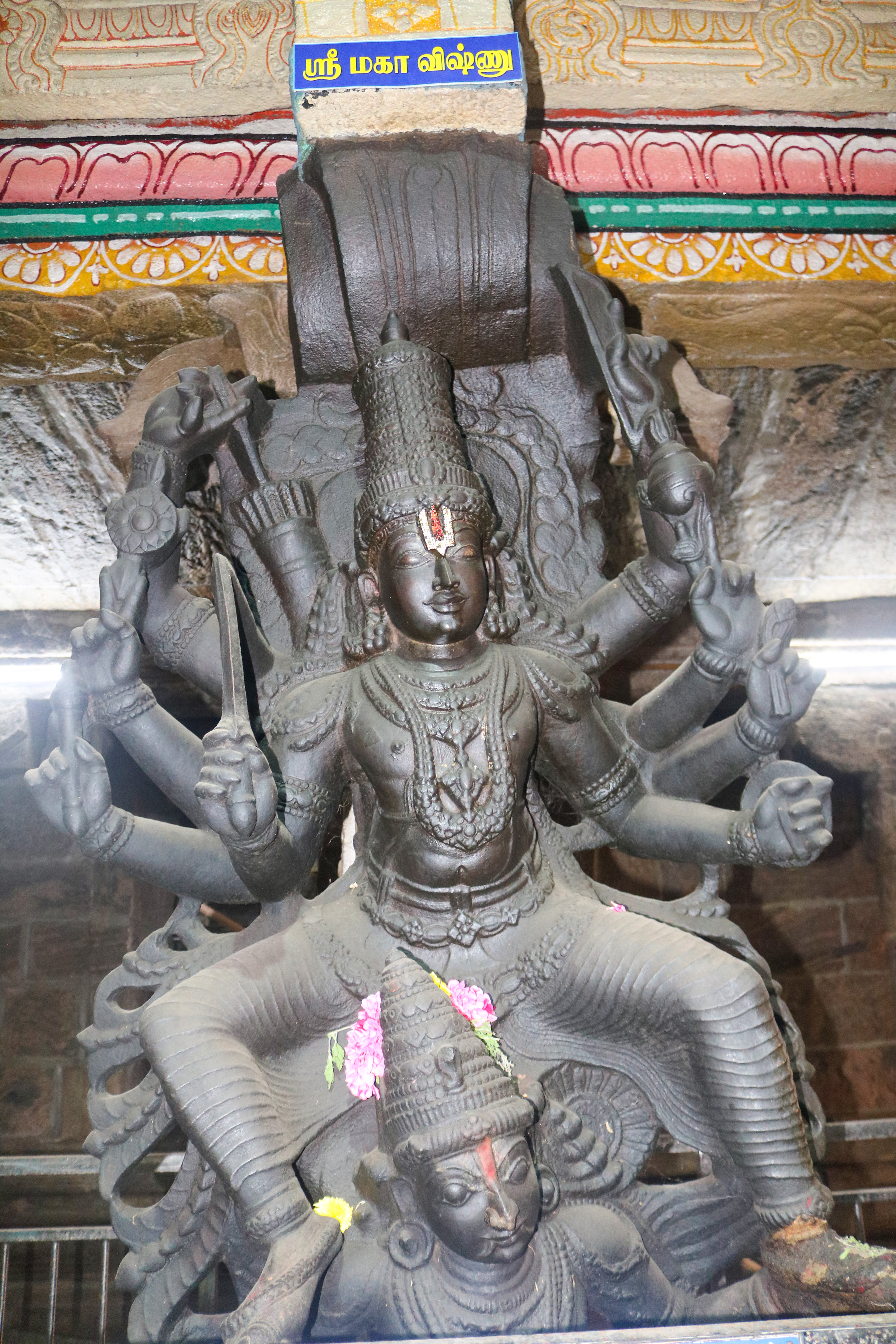 இக்கோயிலிலுள்ள மகாமண்டம், ஊஞ்சல் மண்டபம் மற்றும் அரங்க மண்டபத்தில் உள்ள தூண்களும் அதிலுள்ள சிற்பங்களும் மிக நேர்த்தியான கலைப்படைப்பாக உருவாக்கப்பட்டுள்ளன. மகாமண்டபத்தில் இசைத் தூண்கள் காணப்படுகின்றன. அரங்க மண்டபத்தில் உள்ள பதினான்கு தூண்களில் பிரம்மாண்டமாக ஒற்றைக் கல்லால் சிற்பங்கள் வடிக்கப்பட்டுள்ளன. இவற்றில் மகாபாரதம், இராமாயணம் தொடர்பான சிற்பங்களோடு பிற சைவ, வைணவம் தொடர்பான சிற்பங்களும் காணப்படுகின்றன. வைணவ மற்றும் சைவக் கருப்பொருள்கள் ஒன்றோடொன்று இணைக்கப்படுவது நாயக்கர் கோயில்களில் அவ்வப்போது பின்பற்றப்பட்டது. அந்த வகையில் இக்கோயிலில் சைவ, வைணவ கருத்துக்கள் பிரிவினையின்றிக் காணப்படுகின்றன. இது ஆட்சியாளர்கள் மற்றும் பொதுமக்களிடம் இருக்கும் சகிப்புத்தன்மையைப் பறைசாற்றும் வகையில் அமைந்துள்ளது.