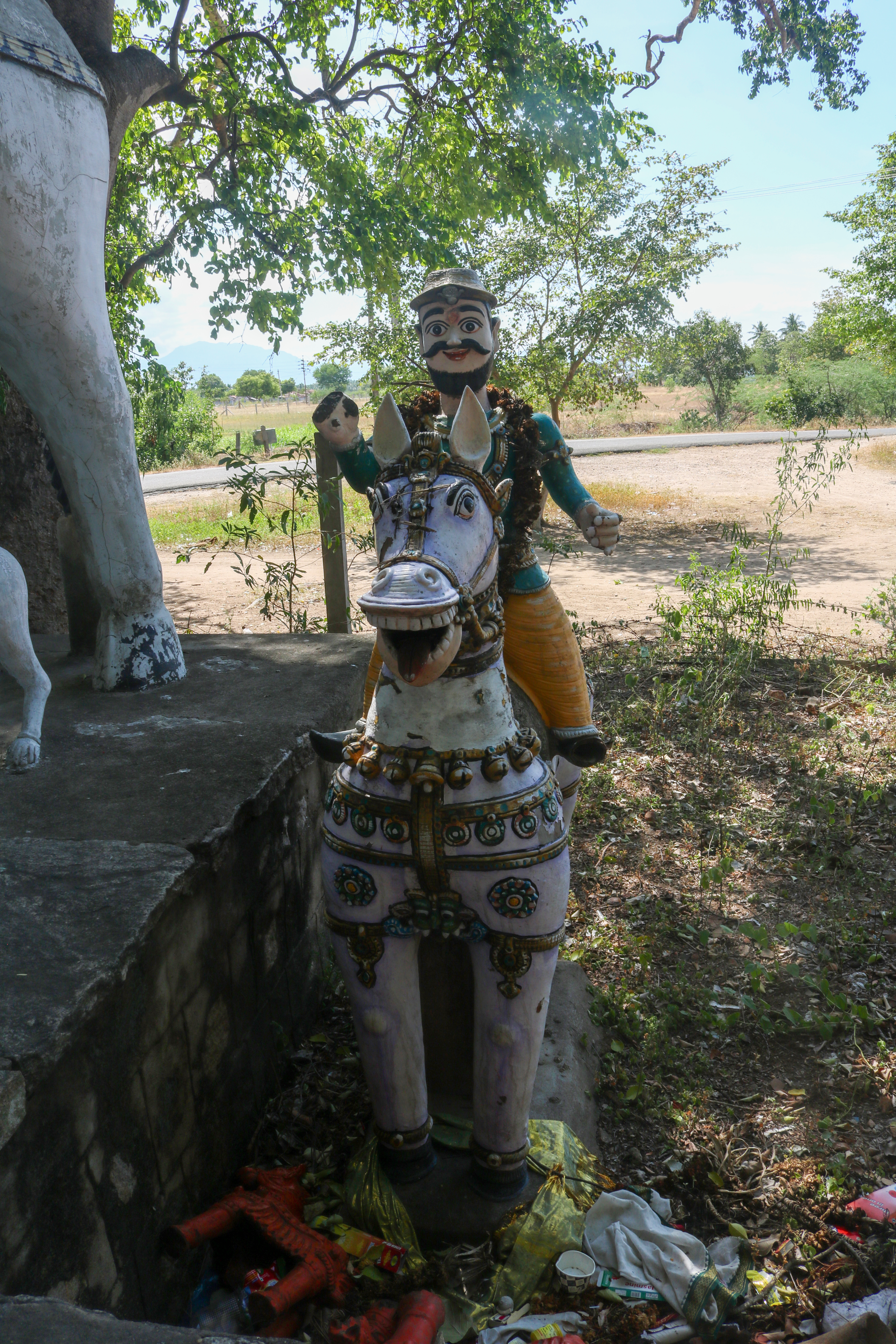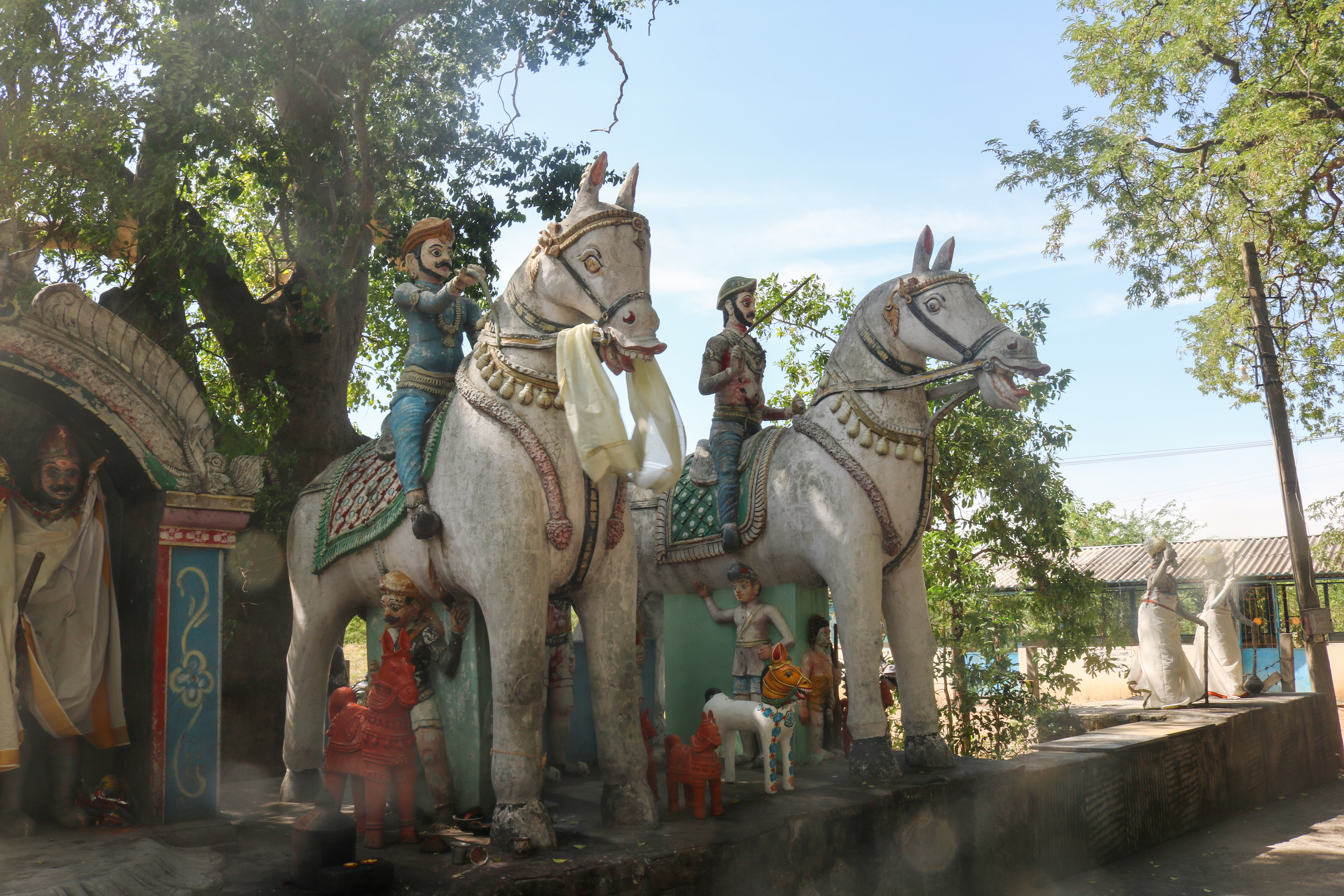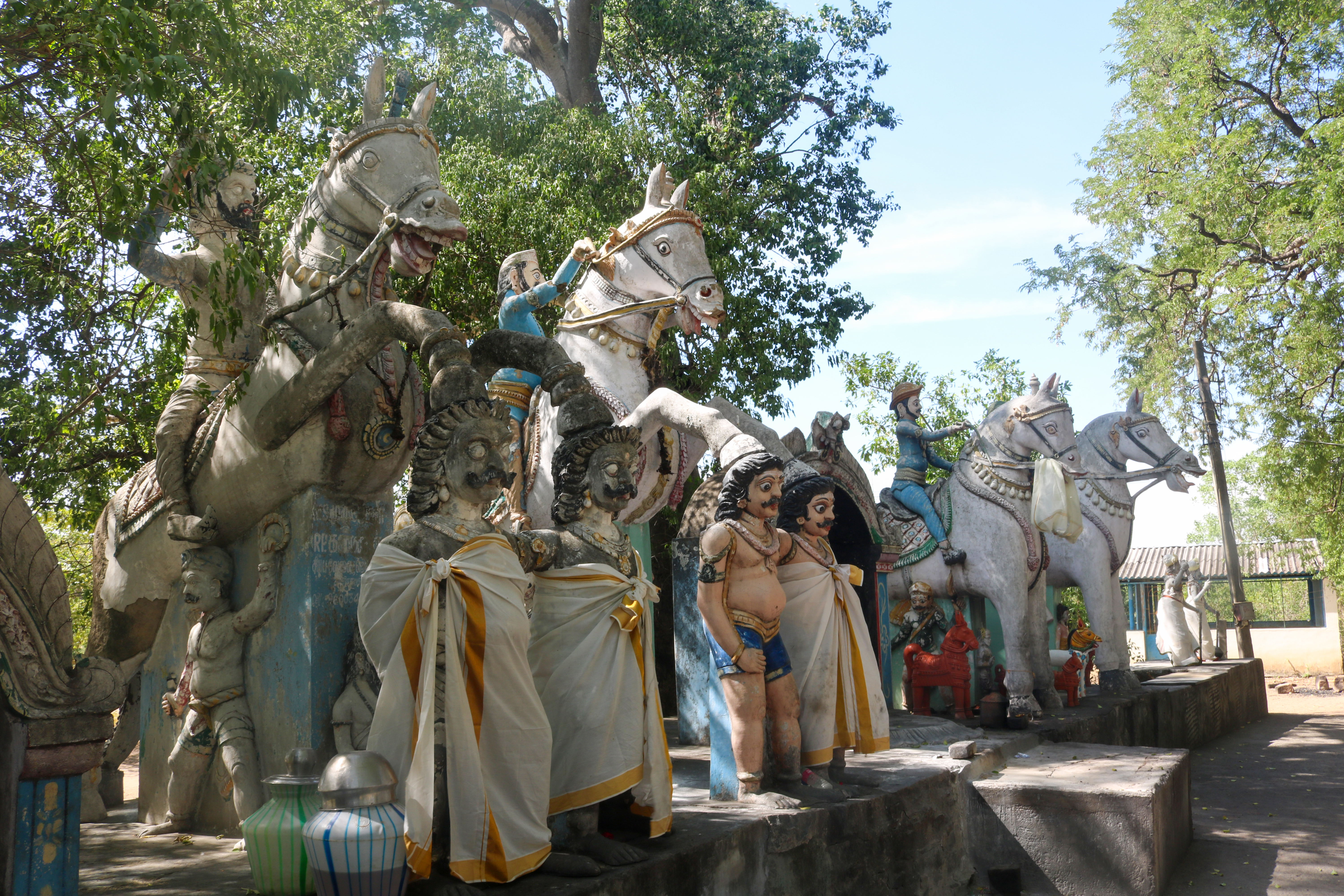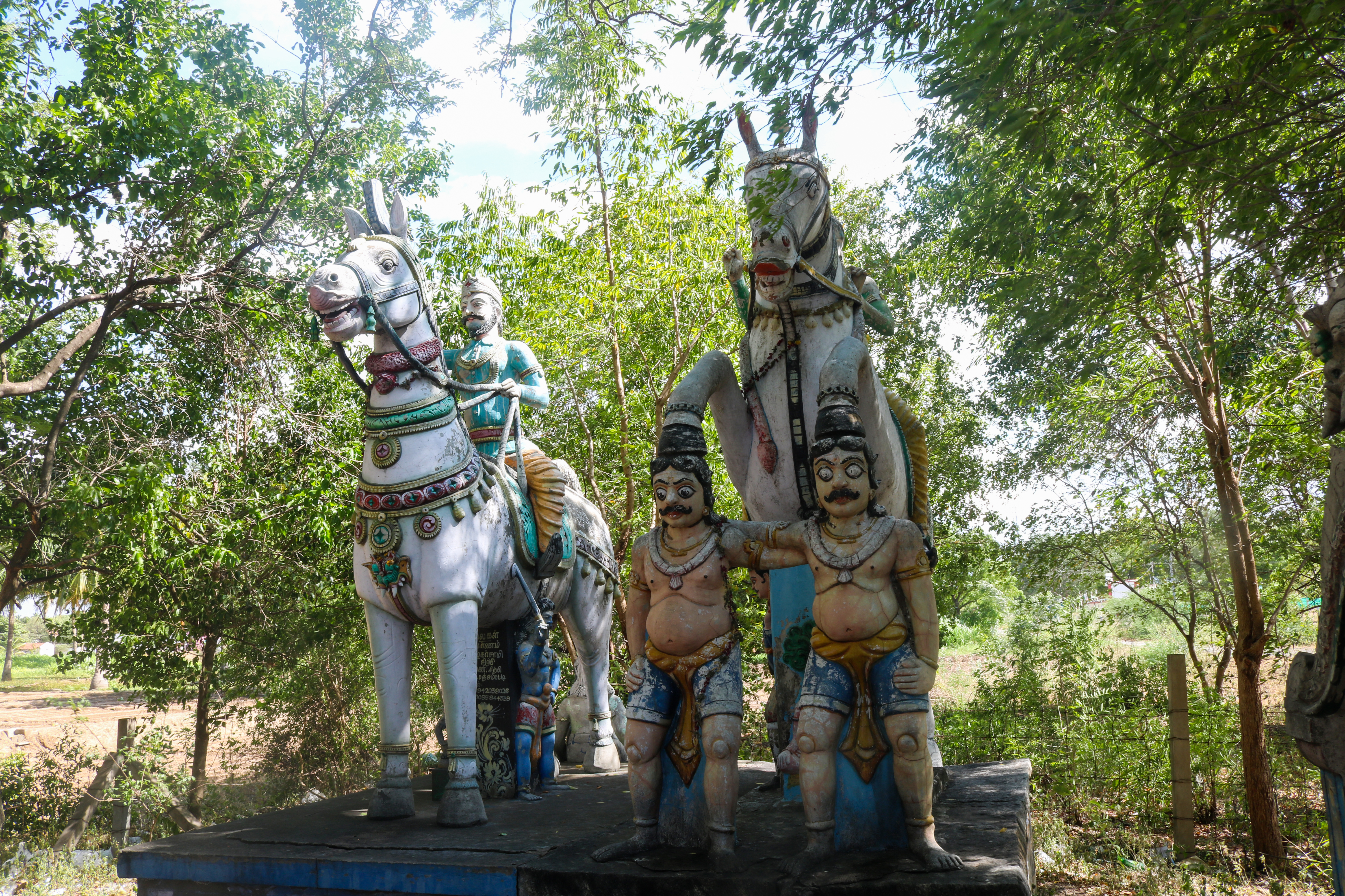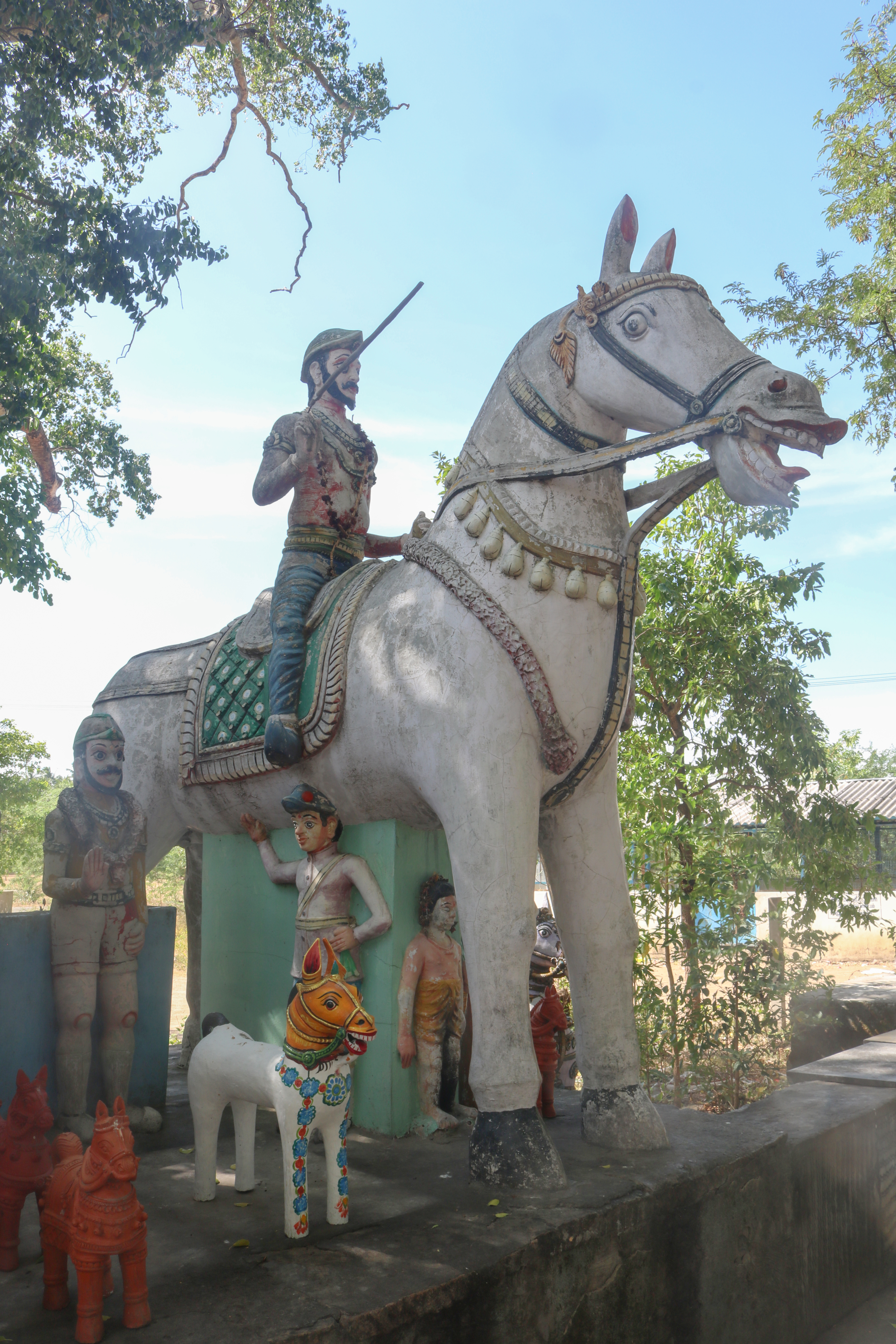 இவ்விடத்தில் மேடை போன்ற அமைப்பின் மேல் ஆறு பெரிய குதிரைகளும், மேடையின் கீழ் ஒரு சிறிய குதிரையும் காணப்படுகின்றன. இவற்றுள் நான்கு பெரிய குதிரைகளின் மேல் அமர்ந்துள்ள வீரர்கள் கிழக்குத் திசையை நோக்கி உள்ளனர், மற்ற இரண்டு பெரிய குதிரைகளின் மேல் உள்ள வீரர்கள் வடக்குத் திசையை நோக்கியபடி வடிவமைக்கப்பட்டுள்ளனர். இந்த ஆறு குதிரைகளில் மூன்று குதிரைகள் தங்கள் முன்னங்கால்களை உயர்த்திப் பூதக்கணங்களின் தலை மேல் வைத்துள்ளனர். குதிரையின் மேல் வடிவமைக்கப்பட்டுள்ள ஆண் உருவங்களில் சிலர் இடைக்கால மன்னர்கள் போலவும் மற்ற சிலர் சிப்பாய்கள் போலவும் உடை உடுத்துள்ளனர். இம்மேடையின் மேல் இரண்டு சிறிய சந்நிதிகள் அமைக்கப்பட்டு அவற்றுள் சிப்பாய் போன்ற வீரர்களின் உருவங்கள் காணப்படுகின்றன. சிப்பாய்கள் துப்பாக்கி பிடித்துள்ளனர். பிற வீரர்கள் வாள் ஏந்தி உள்ளனர்.