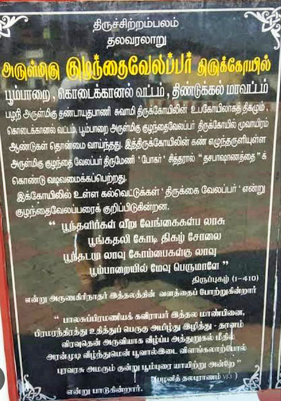 முருகப் பெருமான் குழந்தை வடிவில் தோன்றி அருணகிரிநாதர் என்ற சித்தரை அரக்கனிடமிருந்து காப்பாற்றினார் என்று நம்பப்படுகிறது. இதன் காரணமாகவே இக்கோயிலில் உள்ள முருகன் குழந்தை வேலப்பர் என்ற பெயரால் அழைக்கப்படுகிறார். போகர் என்னும் சித்தர் நவபாசாணக் கலவையைக் கொண்டு, இந்தச் சிலையை உருவாக்கிப் பிரதிஷ்டை செய்ததாகச் செவிவழிச் செய்திகள் கூறுகின்றன. ’நவ’ என்றால் ஒன்பது. ‘பாசாணம்’ என்றால் விஷம் என்று பொருள். நவபாசாணத்தைக் கொண்டு உருவாக்கப்படும் சிலைகள், நல்ல மருத்துவக் குணங்கள் கொண்டவையாக அறியப்படுகின்றன. இக்கோயிலின் தென்மேற்கு நடைபாதையில் போகருக்குத் தனிச் சந்நிதி அமைக்கப்பட்டுள்ளது. மற்றொரு செவிவழி வரலாற்றின் அடிப்படையில், போகரால் பிரதிஷ்டை செய்யப்பட்டு வழிபாட்டில் இருந்த சிலை பல நூறு ஆண்டுகள் கழித்து வழிபாடு இல்லாமல் புறக்கணிக்கப்பட்டுள்ளது. ஒரு சமயம், வேட்டையாட அவ்வழியே வந்த சேர மன்னரின் கனவில் முருகன் தோன்றித் தன்னை மீண்டும் பிரதிஷ்டை செய்து வழிபட வேண்டும் என்று கூறியுள்ளார். அவ்வாறே அந்த மன்னர் சிலையைக் கண்டெடுத்து இப்போதுள்ள கோவிலை உருவாக்கியதாகக் கூறப்படுகிறது.