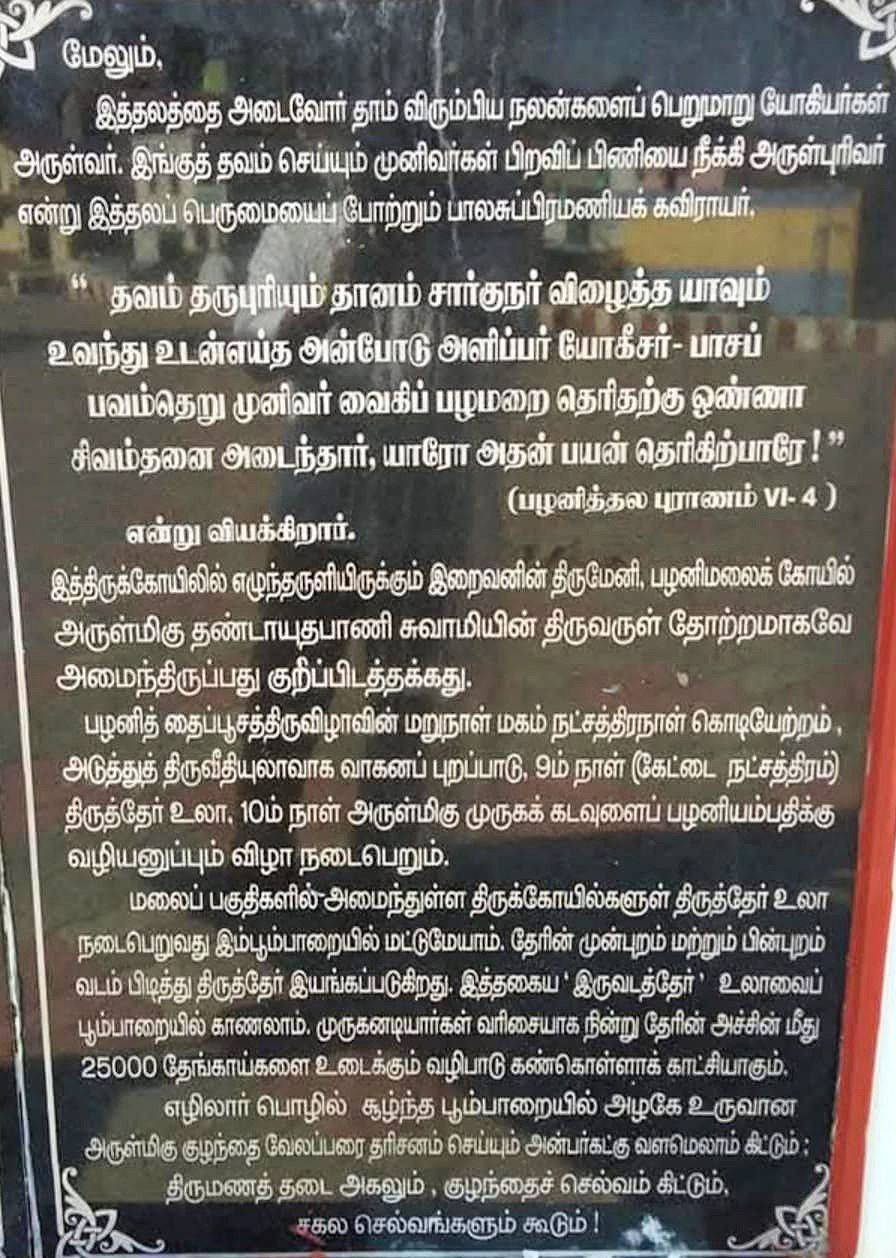 அருணகிரிநாதரின் பூம்பரை வேலன் பாடல் இக்கோயிலின் மகத்துவத்தை அழகாக விவரிக்கிறது. இங்கு முன்புறமும் பின்புறமும் இயக்கப்படும் 'இருவடத் தேர் உலா' நடைபெறுகிறது.